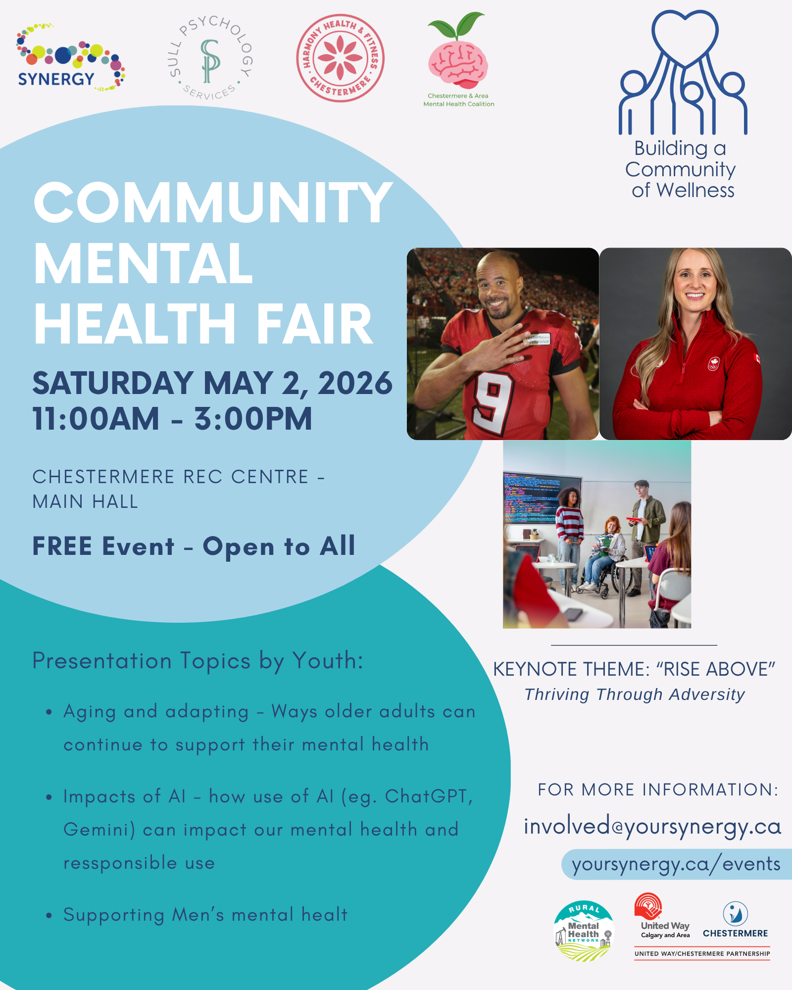 The Community Mental Health Fair is happening on Saturday, May 2, 2026, from 11:00 am to 3:00 pm at the Chestermere Recreation Centre (main hall). It brings together local organizations, youth voices, and a couple of very recognizable Canadian athletes for a day focused on connection, resilience, and real-life mental wellness.