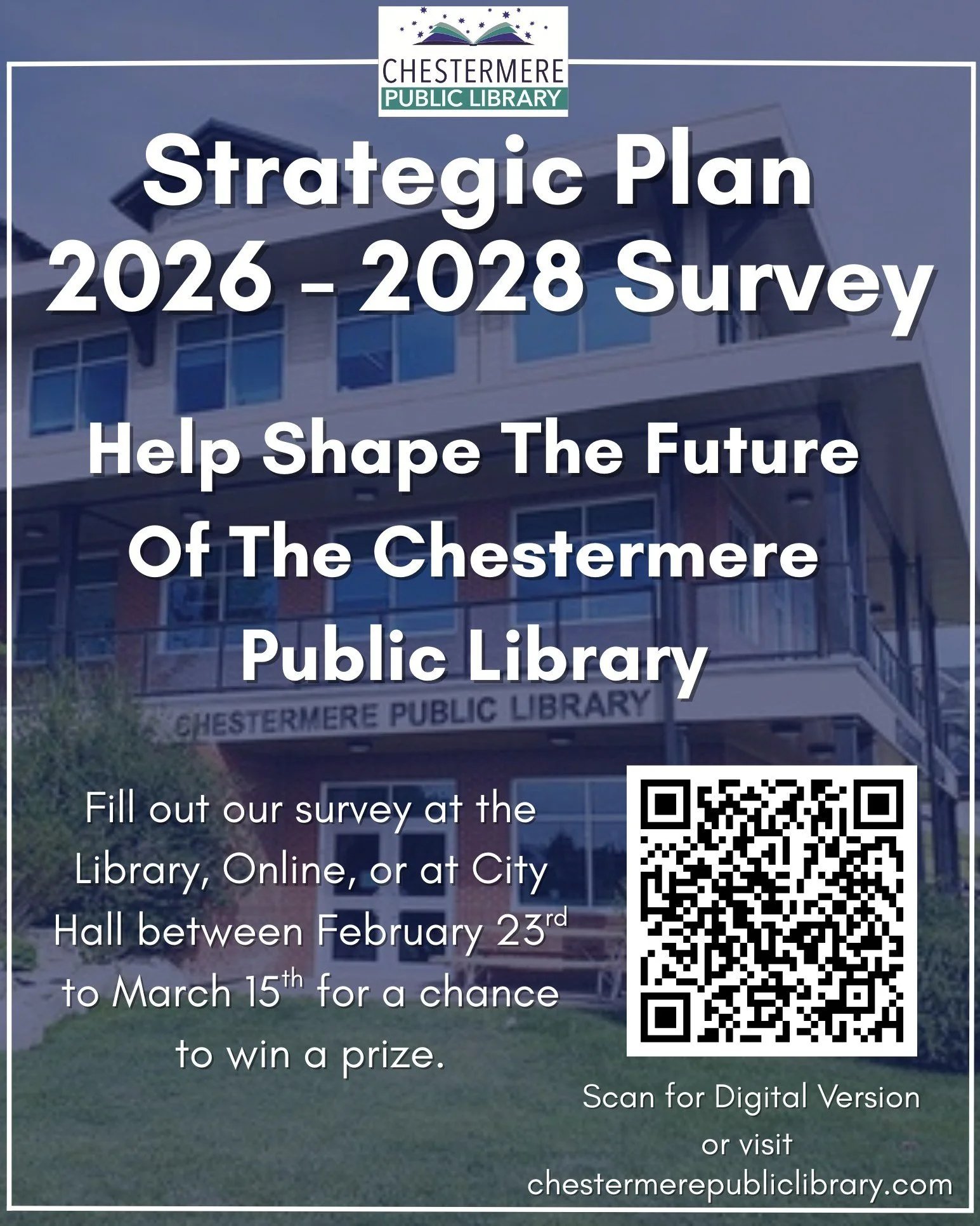 Chestermere Public Library is building its Strategic Plan for June 2026 to June 2028 and wants community input. Residents are invited to complete a short survey and help shape priorities for the years ahead. Bonus: participants can enter for a chance to win a prize.